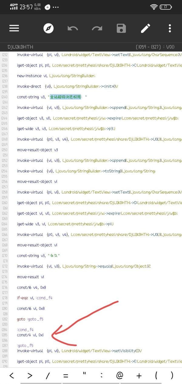 4、点击搜索到的*下面这个,往下翻到1285行,把const/4v1.0x0改成const/4v1.0x1