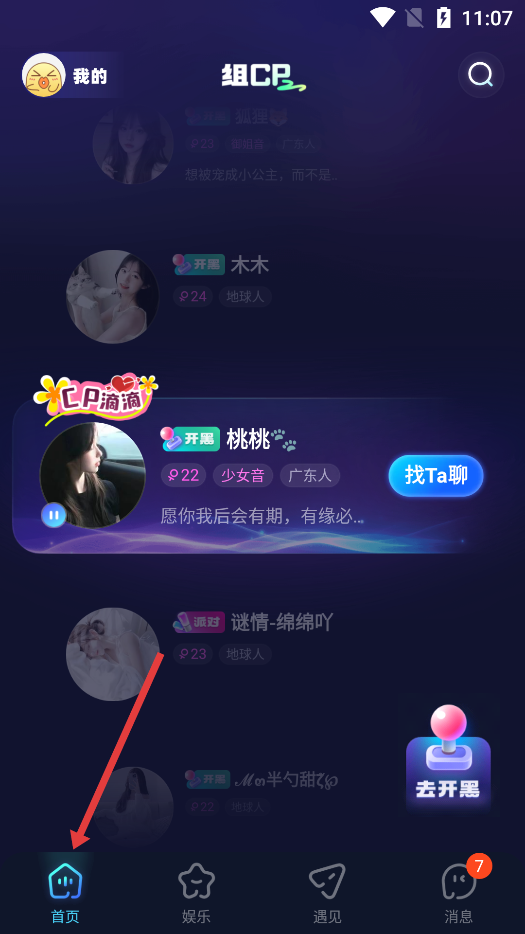 1、点击底部首页,进入组CP界面,浏览用户列表,挑选心仪对象,开启互动交流。