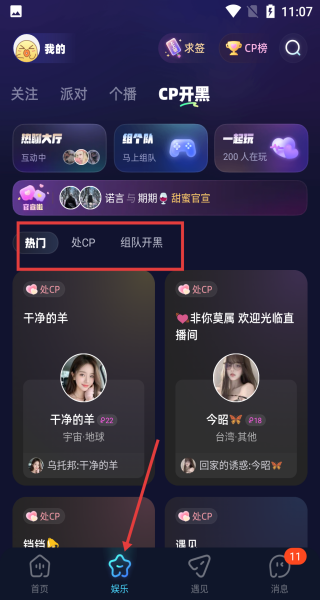 3、点击底部娱乐,进入CP开黑界面,选择热门等分类,参与互动,匹配组队开黑。