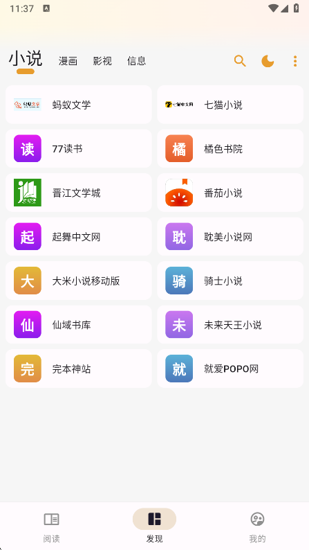 1、这里我们直接来到发现页,可以看到为读者朋友提供了一些能用的小说地址