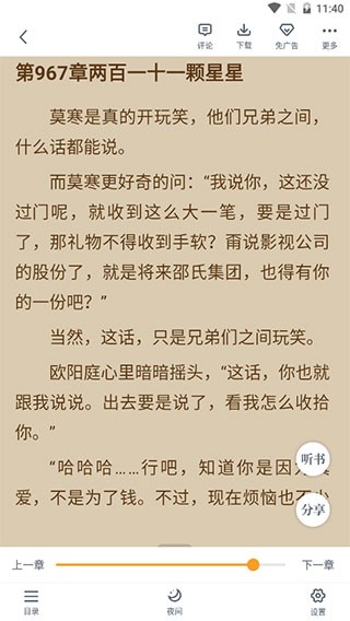 背景颜色、字体、字号任你挑;自定义排版、书签功能、夜间模式等特色功能让你畅享阅读趣味!会员权益“听书”上线,解放双手,从此刻开始。