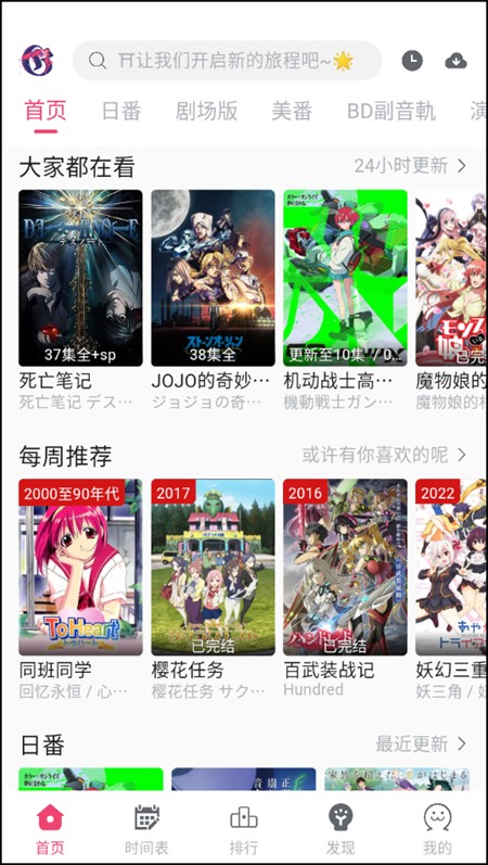 1、在软件首页,我们能够看到超多不同的板块,比如说:日番、剧场版、美番、BD副音轨等。