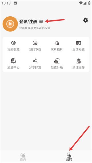 4、点击我的进行登录注册成为会员可享受更多观影权益,还能使用我的收藏我的下载等功能。