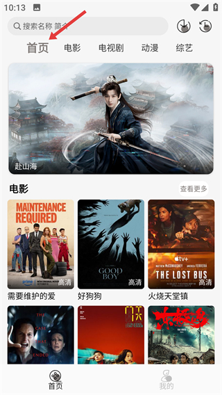 1、进入首页可看到推荐影视及电影板块,能直接挑选展示的电影观看也可通过搜索栏查找想看的内容。