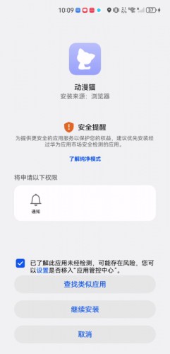 3、接下来点击勾选“已了解此应用未经检测……”,点击“继续安装”。(还可以点击了解纯净模式)