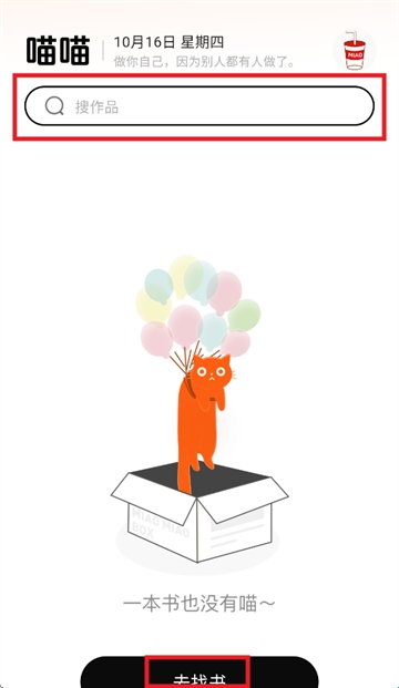 1、打开喵小乐app,进入首页点击搜索框或“找书”入口。