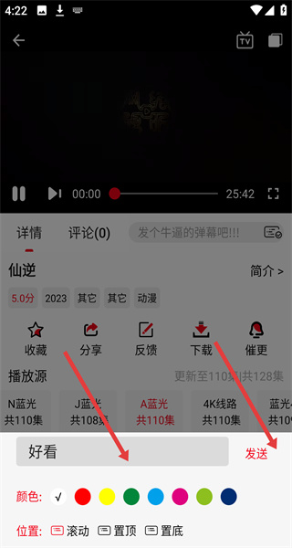 3、在弹幕输入框,输入想要发送的弹幕内容,比如好看,并可选择弹幕的颜色等设置。