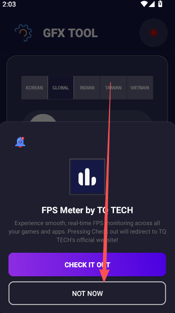 1、打开应用后,开屏页面提示跳转至第三方网站,点击【NOT NOW】直接进入画质修改界面。