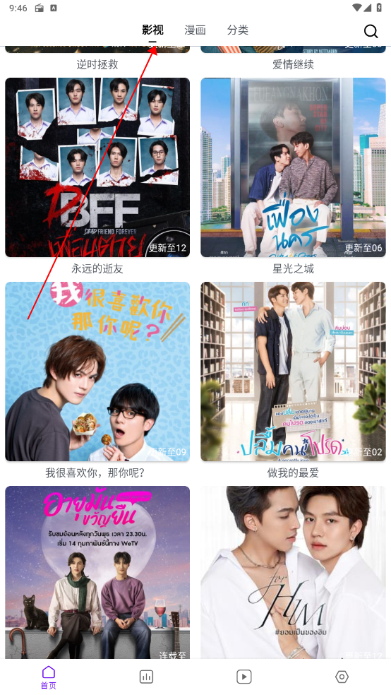 2、进入首页,可以看到上方的【影视】、【漫画】等分区