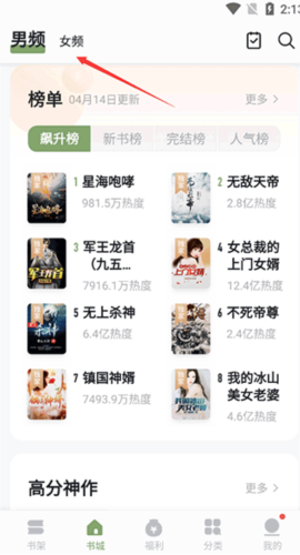1、首先我们下载安装好郁书坊app后,进入主页面会发现有很多内容选项,很新书,我们可以在左上角选择男女阅读的。