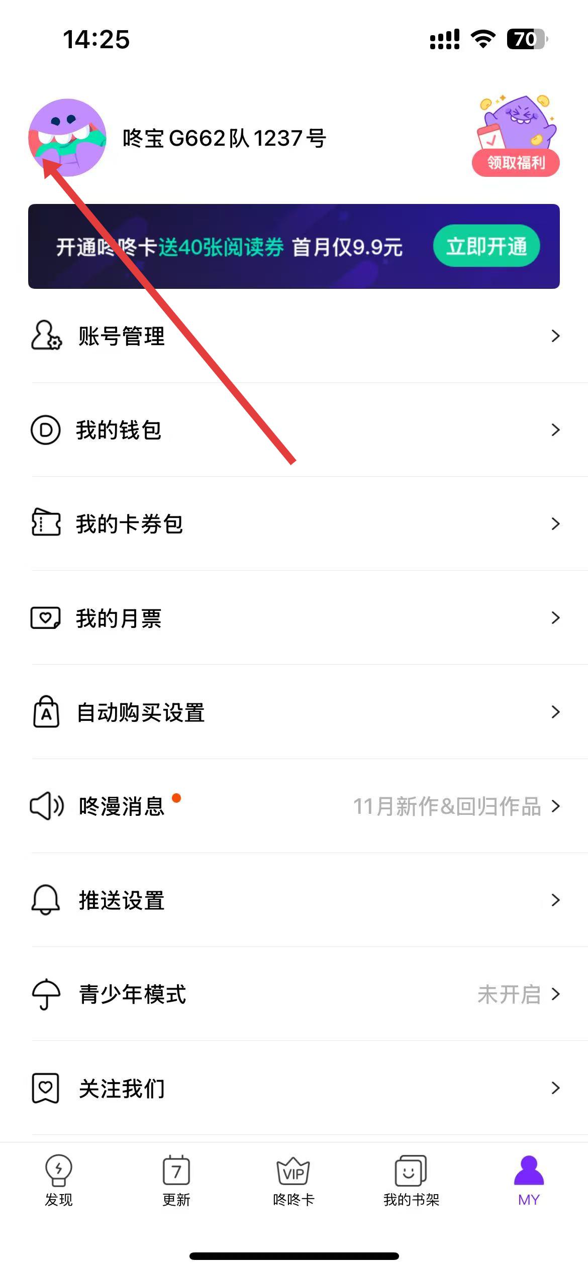 3、登录后可见个人头像和昵称,如咚宝G662队1237号,可进行账号管理、查看卡券包等操作,享受个性化漫画阅读服务。