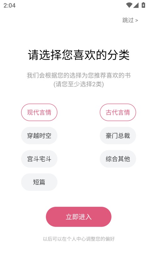 1、下载安装言情控,进入软件前选择你喜欢的分类,为你推荐更多你喜欢的小说类型,可以跳过。