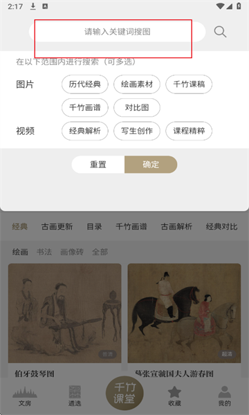 2、输入关键词搜图,还能在历代经典、千竹画谱、绘画素材等多个范围内进行多选筛选。