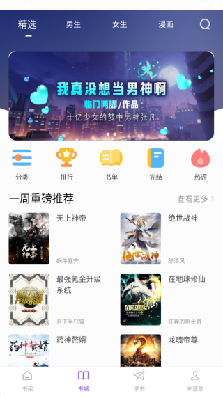3、点击书城板块,涵盖了精选、男生、女生、漫画等书籍,用户可以选择阅读。