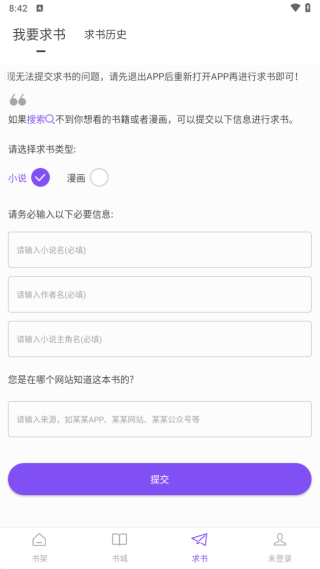 4、求书板块,用户可以选择求书类型,输入求书信息,点击提交即可。