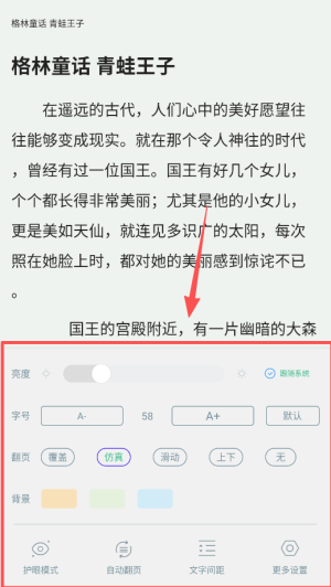 5、然后点击设置按钮即可调整字体大小、背景颜色、翻页方式等