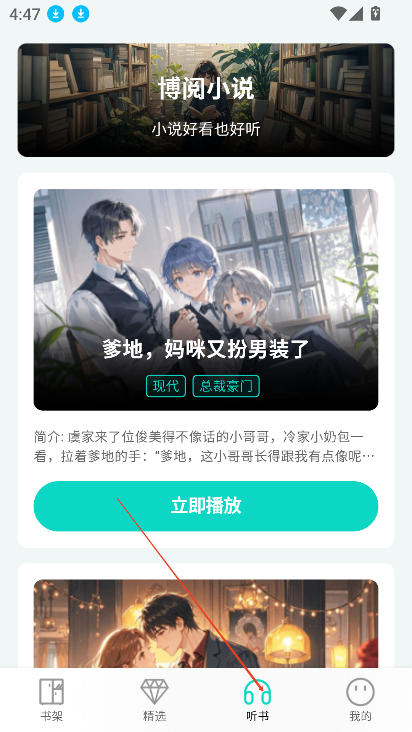 2、除小说作品之外,该软件还支持听书功能,点击听书,挑选一本即可开始播放。