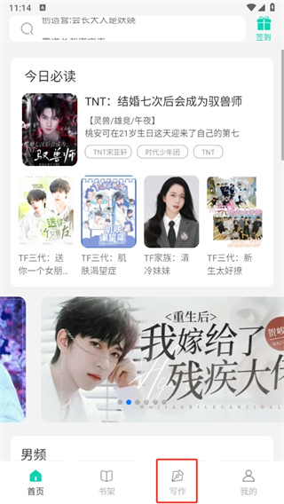 1、首先打开话本小说极速版软件,进入到首页切换到【写作】的页面;