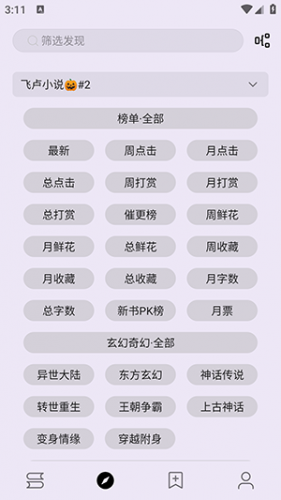 3、点击发现板块,会显示所有的小说书源,可以直接点击分类。