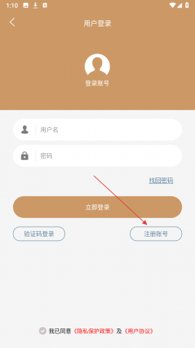 3、在登录页,点击【注册账号】跳转至注册界面。