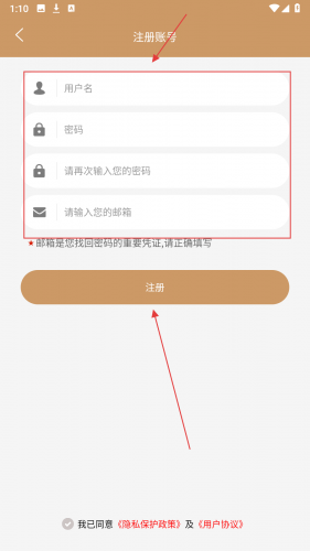 4、在注册页,【填写信息】后点击【注册】即可完成账号创建。