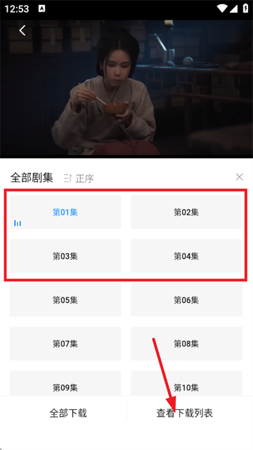 3、选择集数点击下载,随后点击查看下载列表;