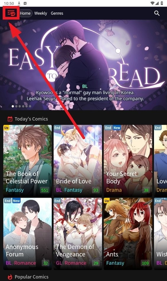 打开Toomics app,点击左上角home旁边的图标;