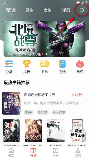 5、如果要看漫画,在“书城”界面,点击分类最后一个“漫画”,就进入到漫画专区。
