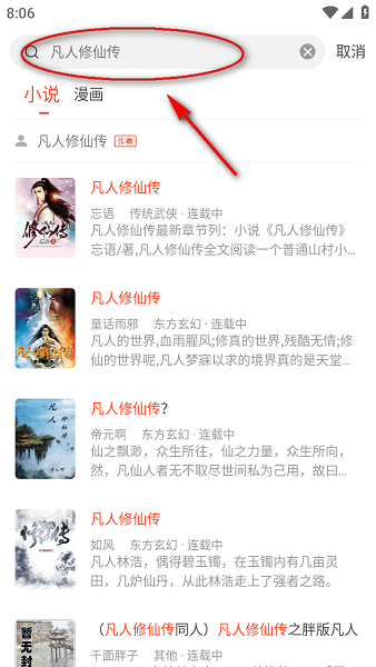 2、右上角的放大镜图标可以搜索要看的小说,比如凡人修仙传;