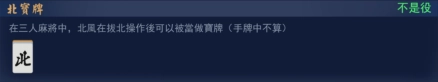 在三人麻将中,北风在拔北操作后可以被当作宝牌(手牌中不算) 不是役 |