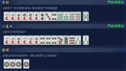 4组顺子+非役牌的雀头+最后是顺子的两面听 门前清限定 |