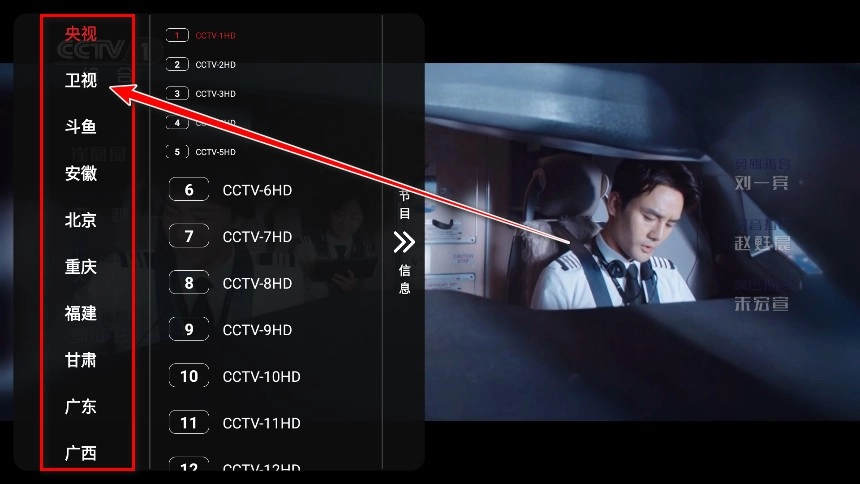 点击手机屏幕后,左侧会呈现卫视、地方台等频道分类,你可以从中挑选自己想要观看的频道类型。