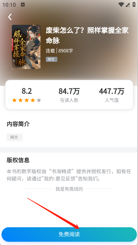 3、用户点开想看的小说进入详情页,点击免费阅读。
