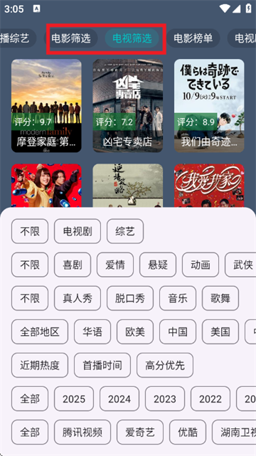 3、支持电影和电视剧分类筛选,点击右下角蓝色按钮即可筛选。