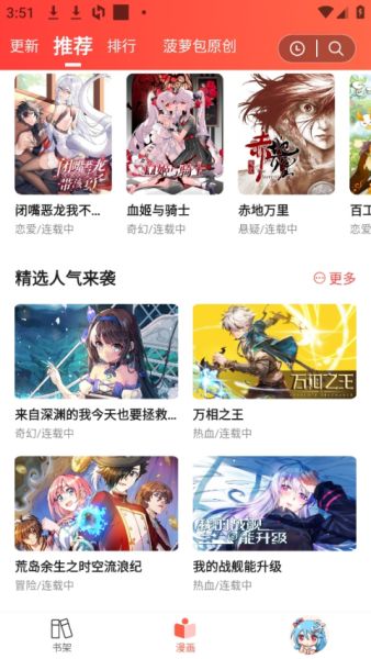 1、打开菠萝包漫画APP,在首页有各种热门漫画推荐;