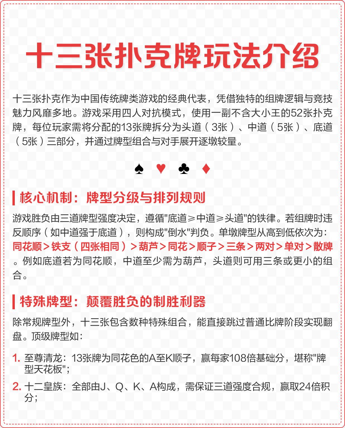 十三张扑克作为中国传统牌类游戏的经典代表,采用四人对抗模式,使用一副不含大小王的52张扑克牌。玩家需将13张牌拆分为头道(3张)、中道(5张)、底道(5张),通过牌型组合与对手展开逐墩比拼。