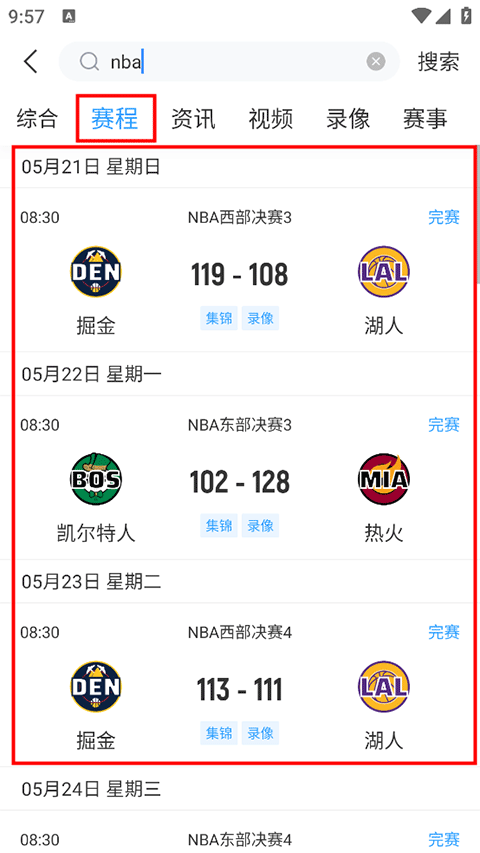 2、在搜索结果中进入“赛程”页面,即可查看近期所有NBA比赛的时间安排。