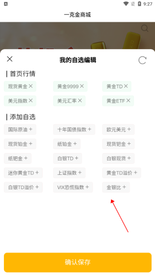 2、进入自选编辑面板后,勾选您关注的黄金或贵金属行情品种,完成添加;