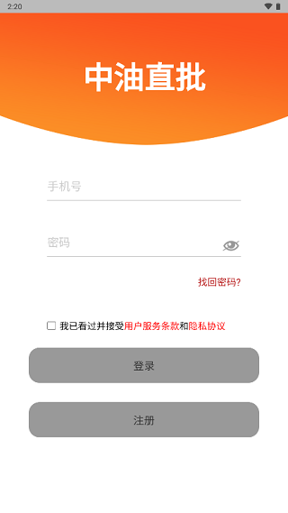 1、打开中油直批app最新版本,阅读并勾选用户协议,点击“注册”按钮。