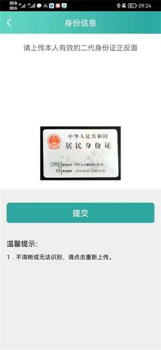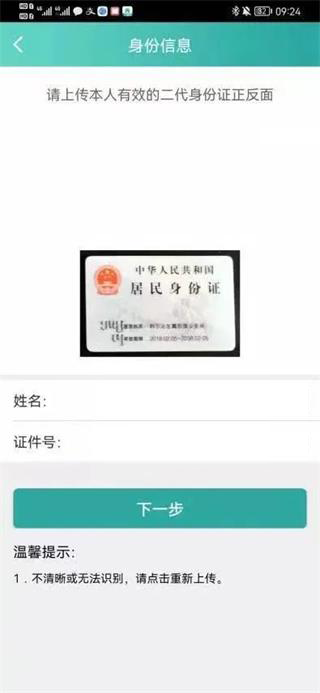 4. 按提示上传身份证正反面照片,系统将自动识别姓名与身份证号码。确认信息准确后,点击“下一步”。