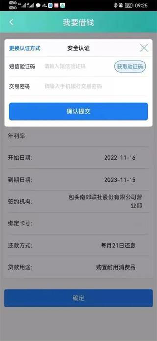 6. 人脸识别成功后,进入安全认证页面,输入短信验证码及交易密码,点击“确认提交”,即完成贷款申请与放款操作。