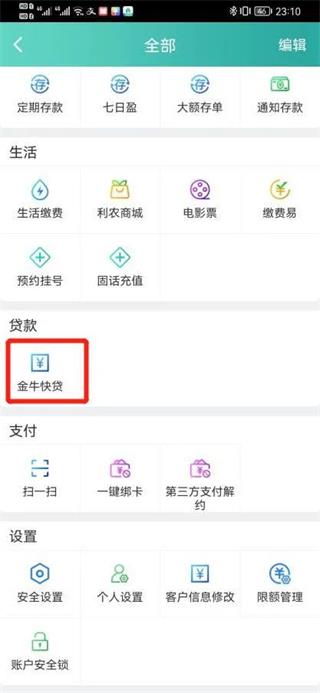 1. 打开app首页,点击“全部”进入功能菜单,选择“金牛快贷”。