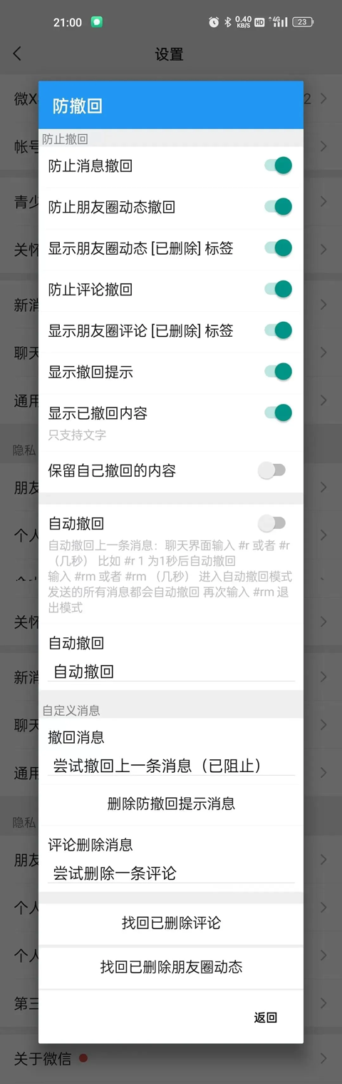 6、重新打开微信,在设置中下拉找到“微X模块”入口,进入后启用“防撤回”等核心功能。
