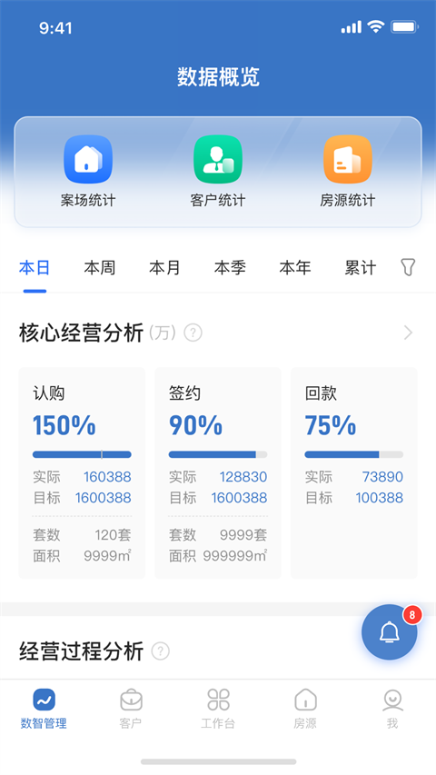 1、数智管理:集成案场统计、客户统计与房源统计等多维数据概览,并提供核心经营分析功能,助力管理者实时掌握销售动态。