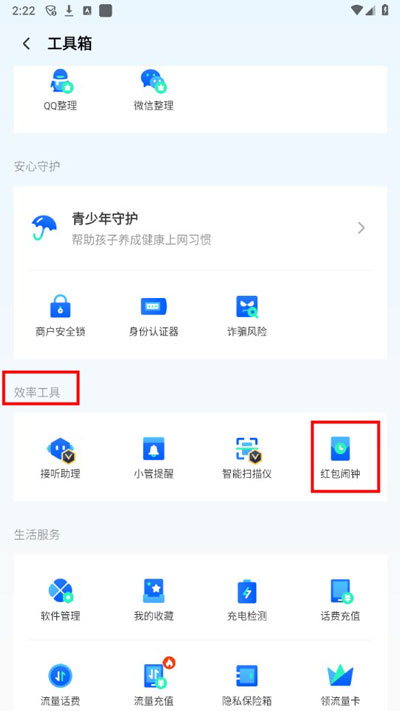 2. 向下滑动至“效率工具”区域,选择“红包闹钟”;