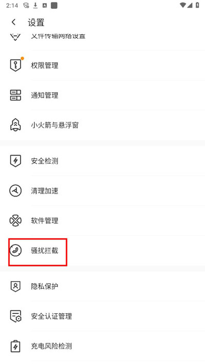 进入“骚扰拦截”界面 → 点击右上角设置图标 → 找到“夜间防打扰模式”并关闭即可。