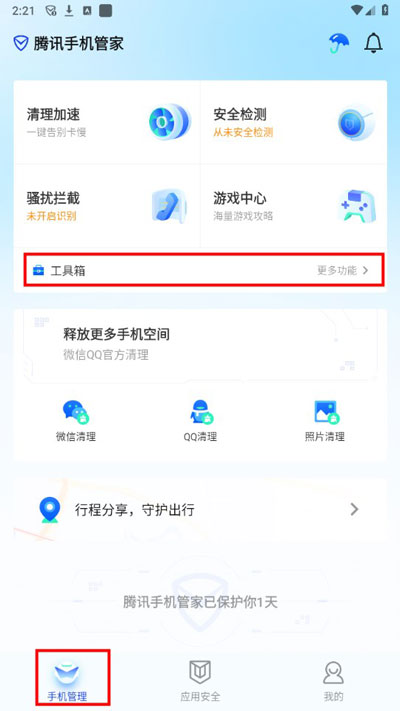 1. 打开腾讯手机管家,在首页进入“工具箱”,点击“更多功能”;