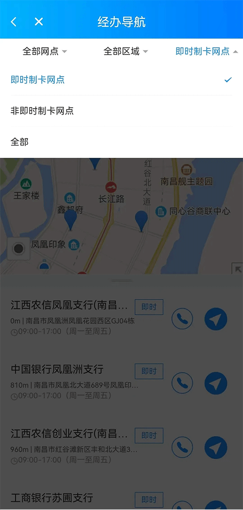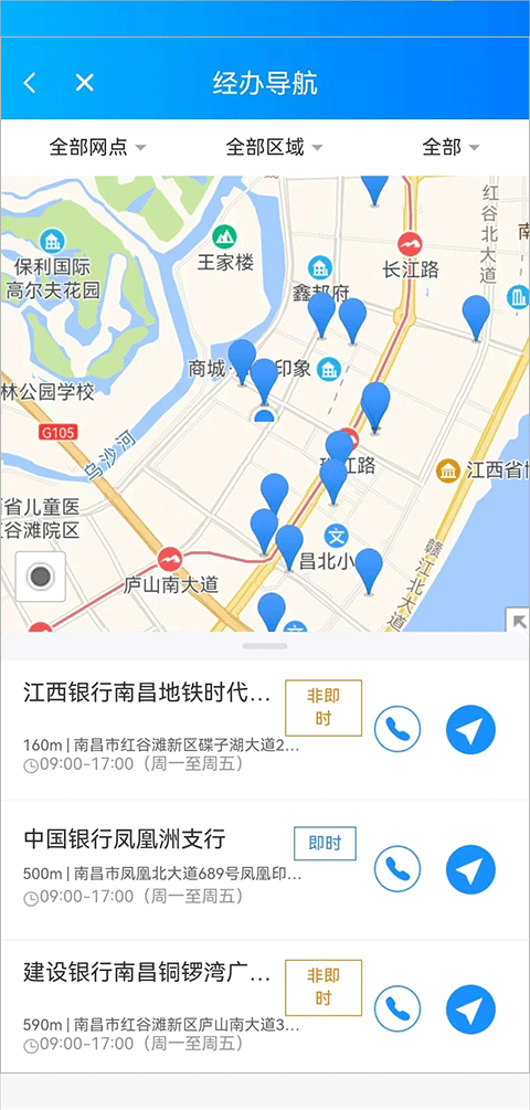 1、打开“经办导航”模块,系统将基于用户当前位置,自动推荐附近的合作金融服务网点,并展示地址、联系电话等关键信息。