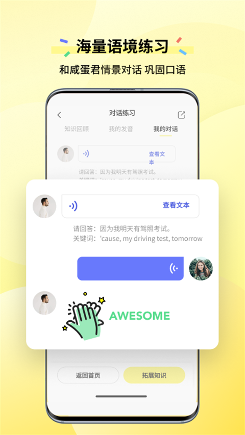 与虚拟伙伴“咸蛋君”进行多样化情景对话,在真实语境中反复练习,巩固口语输出能力。