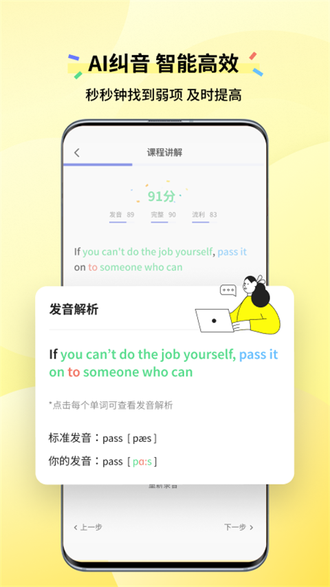智能评分:采用国际前沿AI发音识别技术,清晰识别多种发音口音,精准评估发音质量。